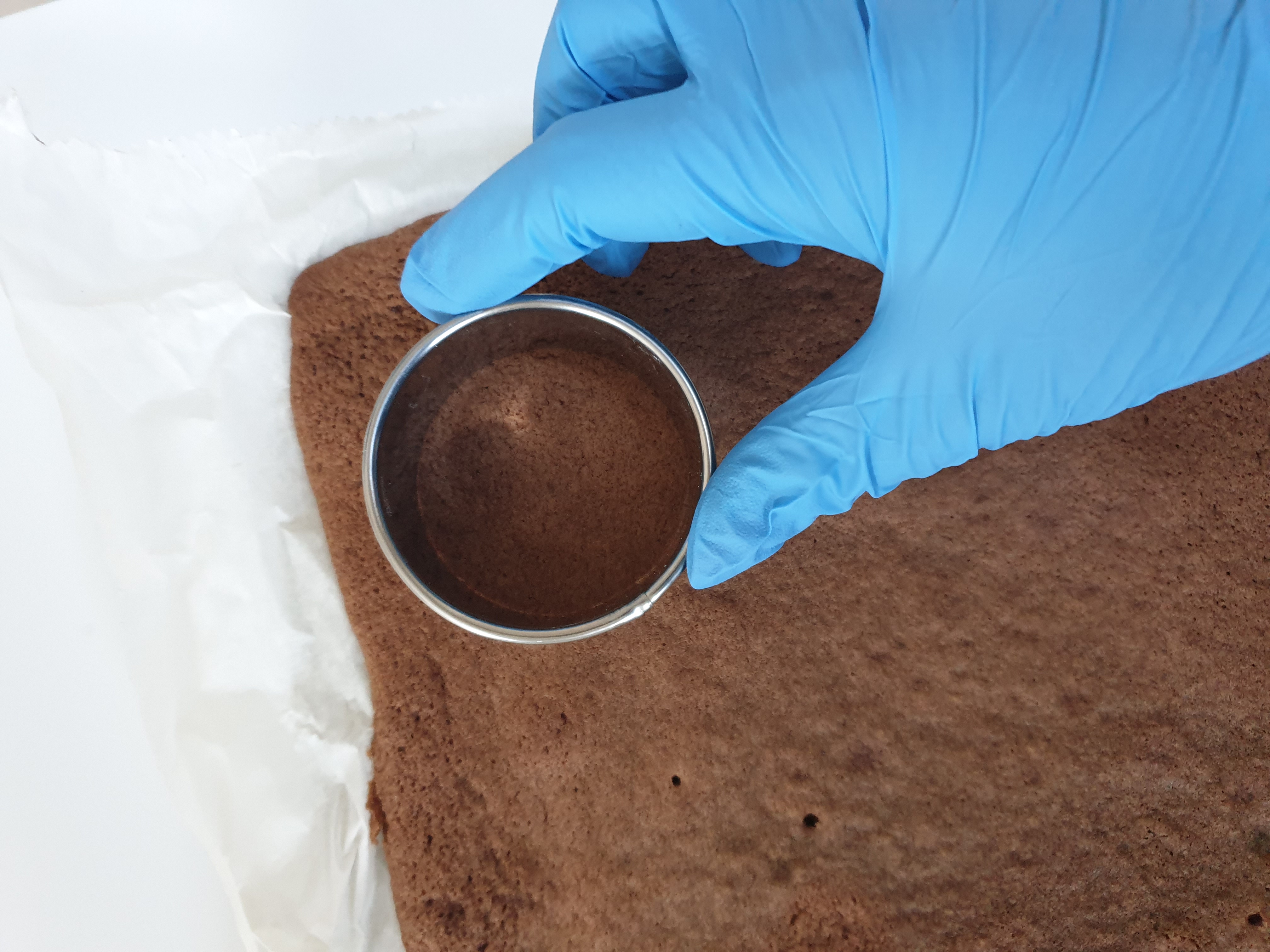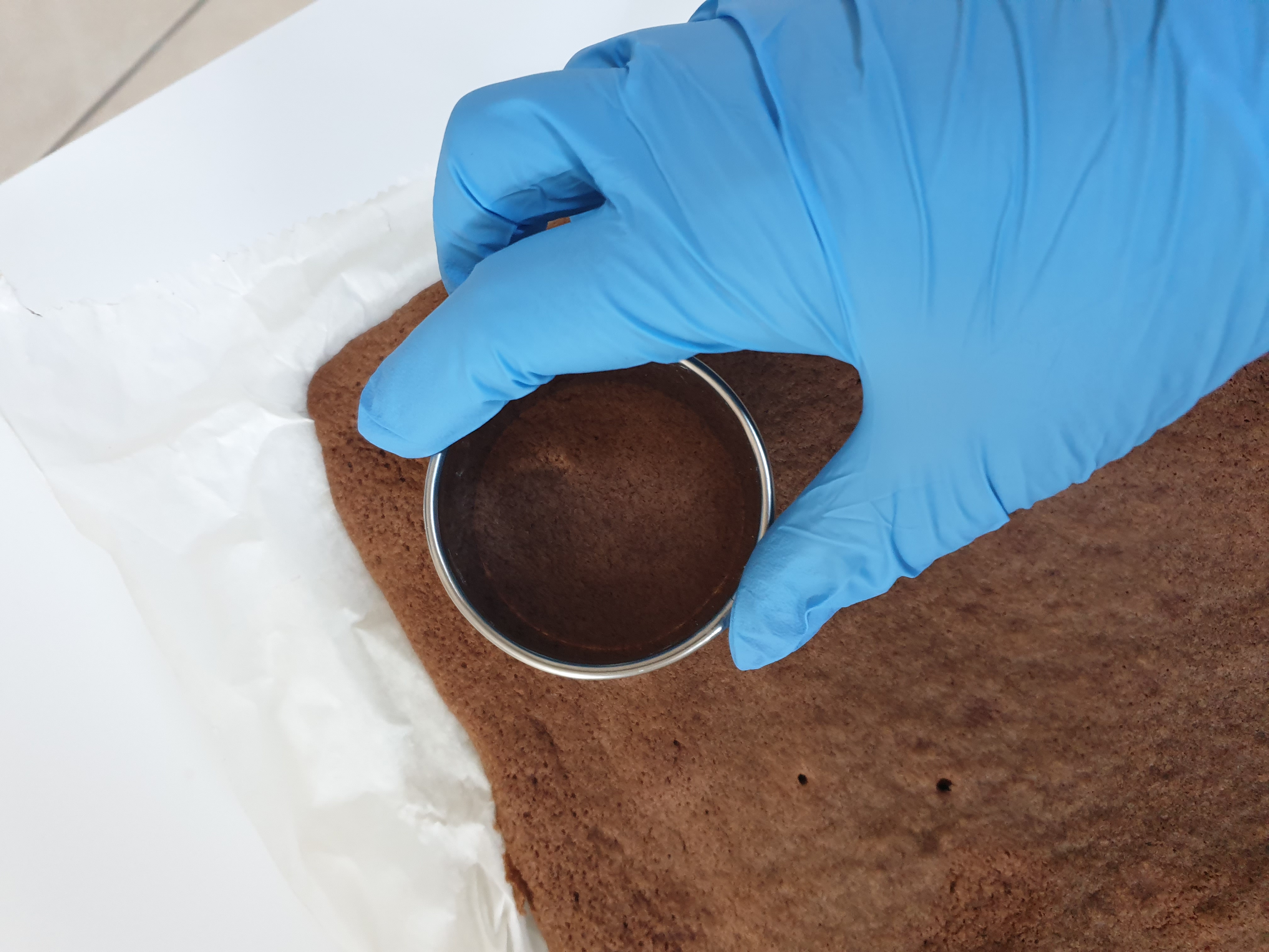 - Using a medium round cookie cutter, gently place the cutter at the top left corner of the cake sheet.
