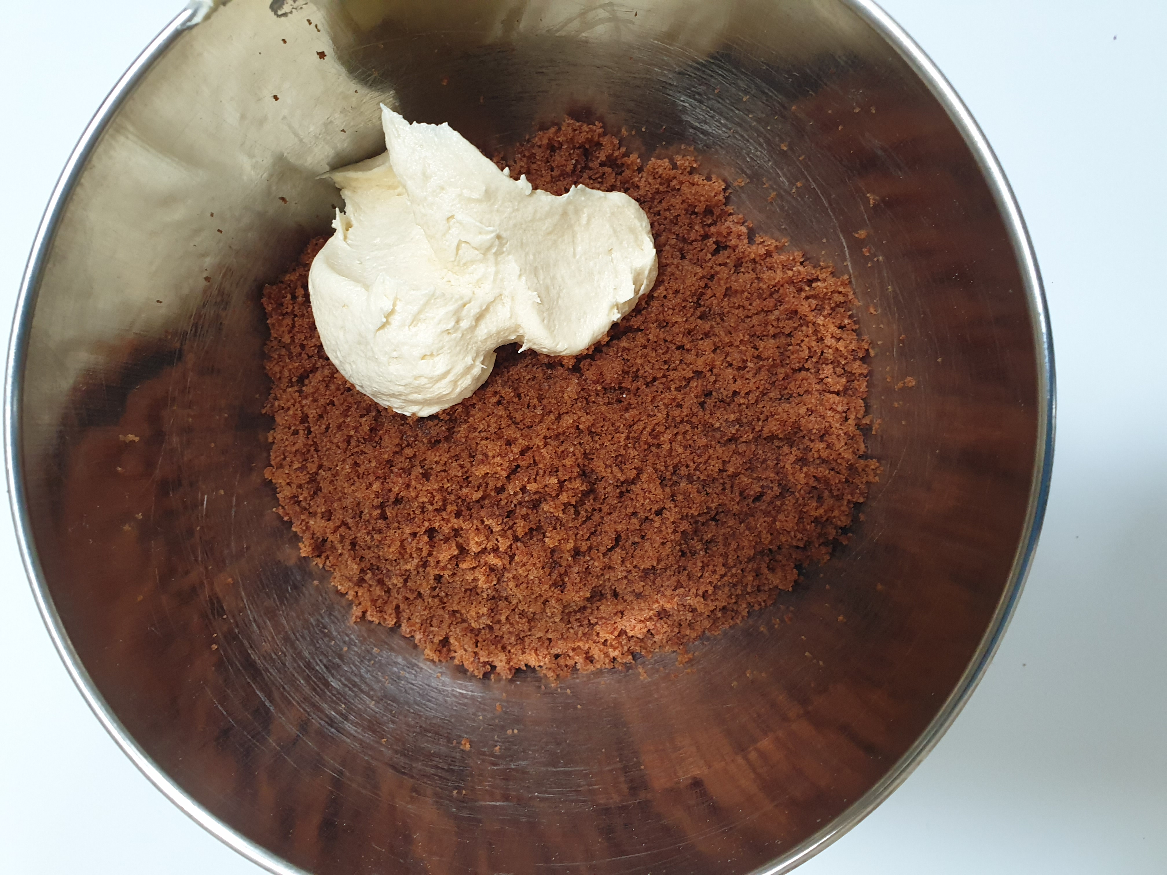 - Take some of your buttercream and pop it into the small mixing bowl on top of the cake crumbs.
