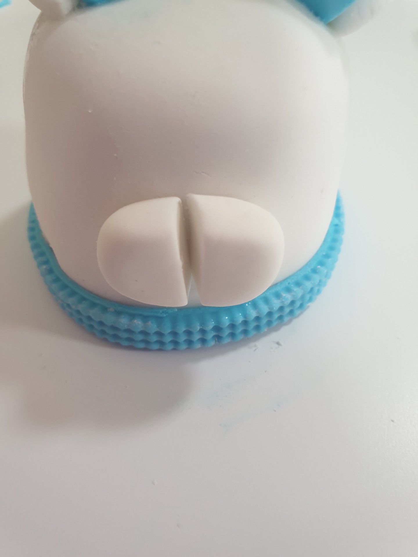 - Roll out the blue fondant, and this time, cut out 2 small sized bunny ears.