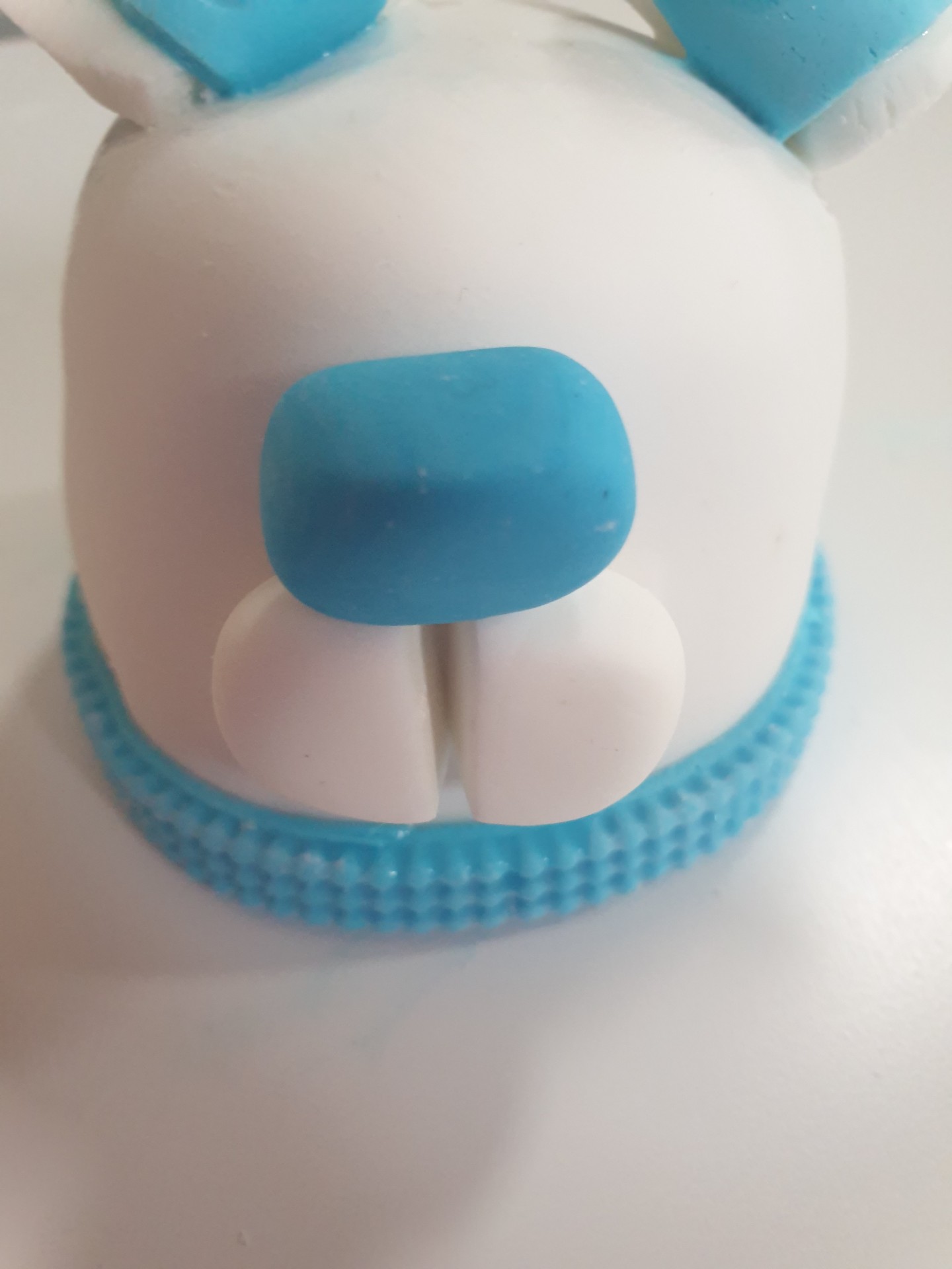 - Roll a small piece of blue fondant and shape it into a rectangular nose.