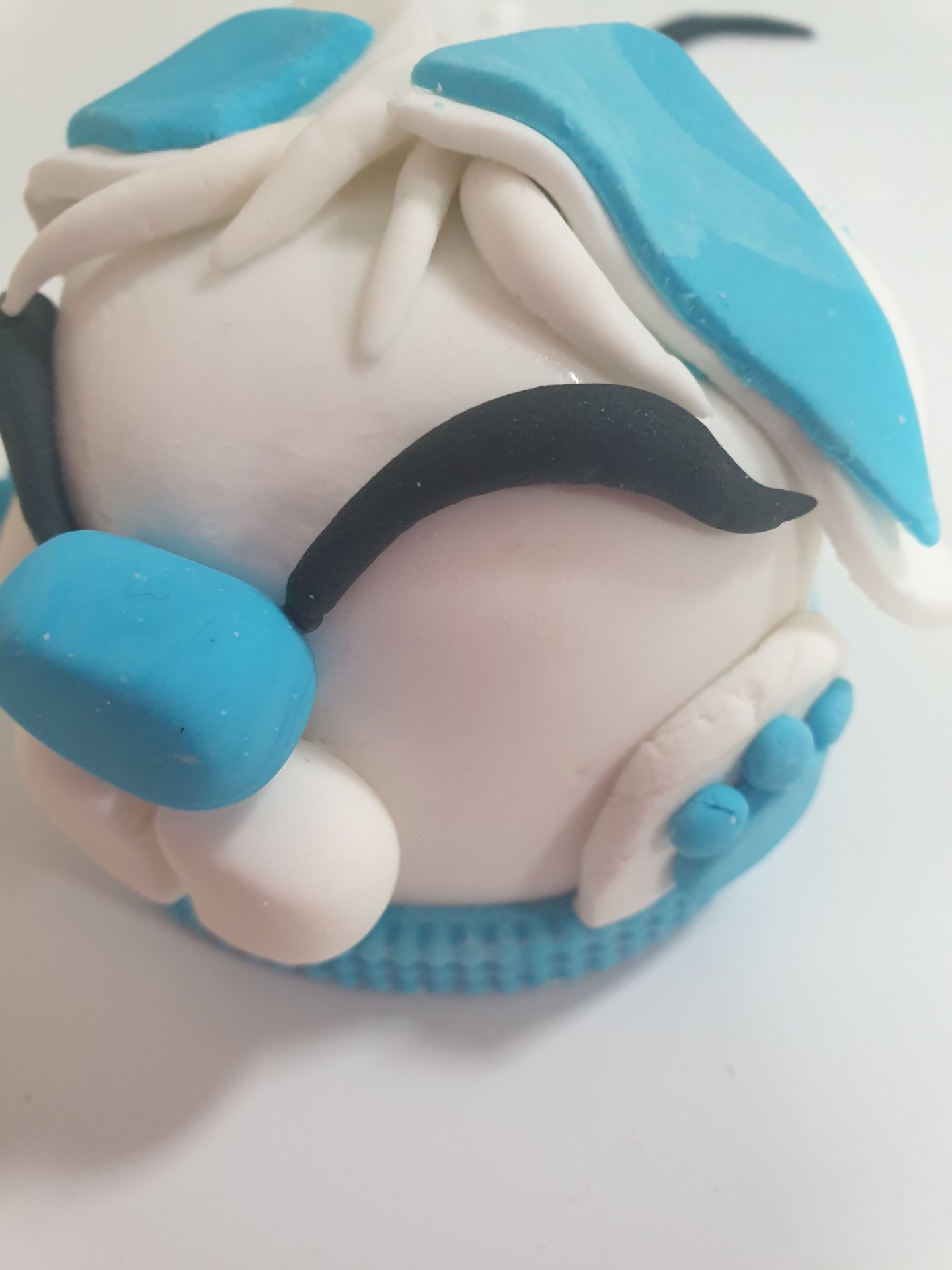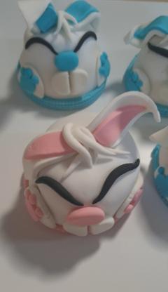 - Taking more white fondant, roll out a long snake shape and cut into sections to create strands of hair. Stick these on the bunny's head (between the ears) as per picture.
