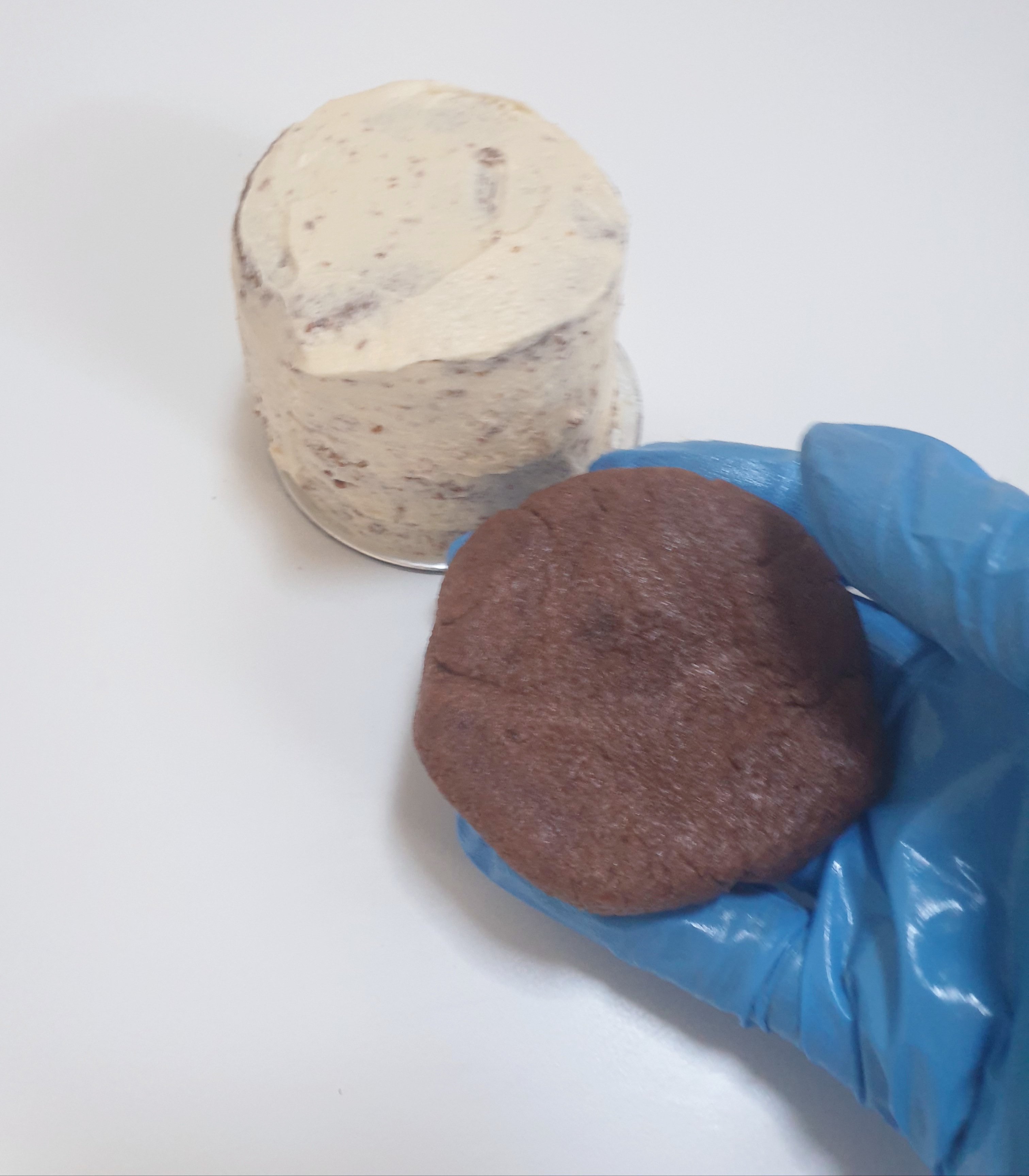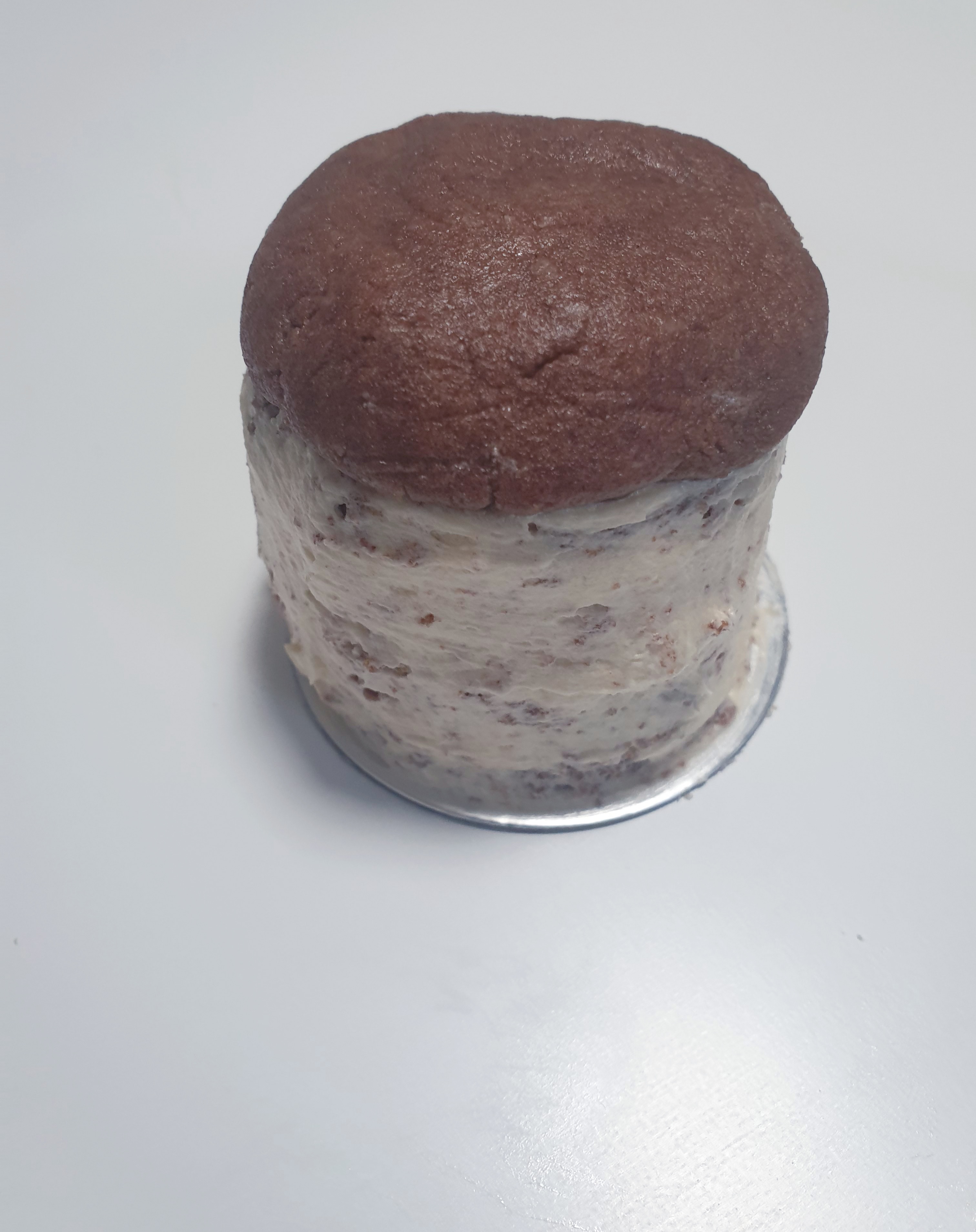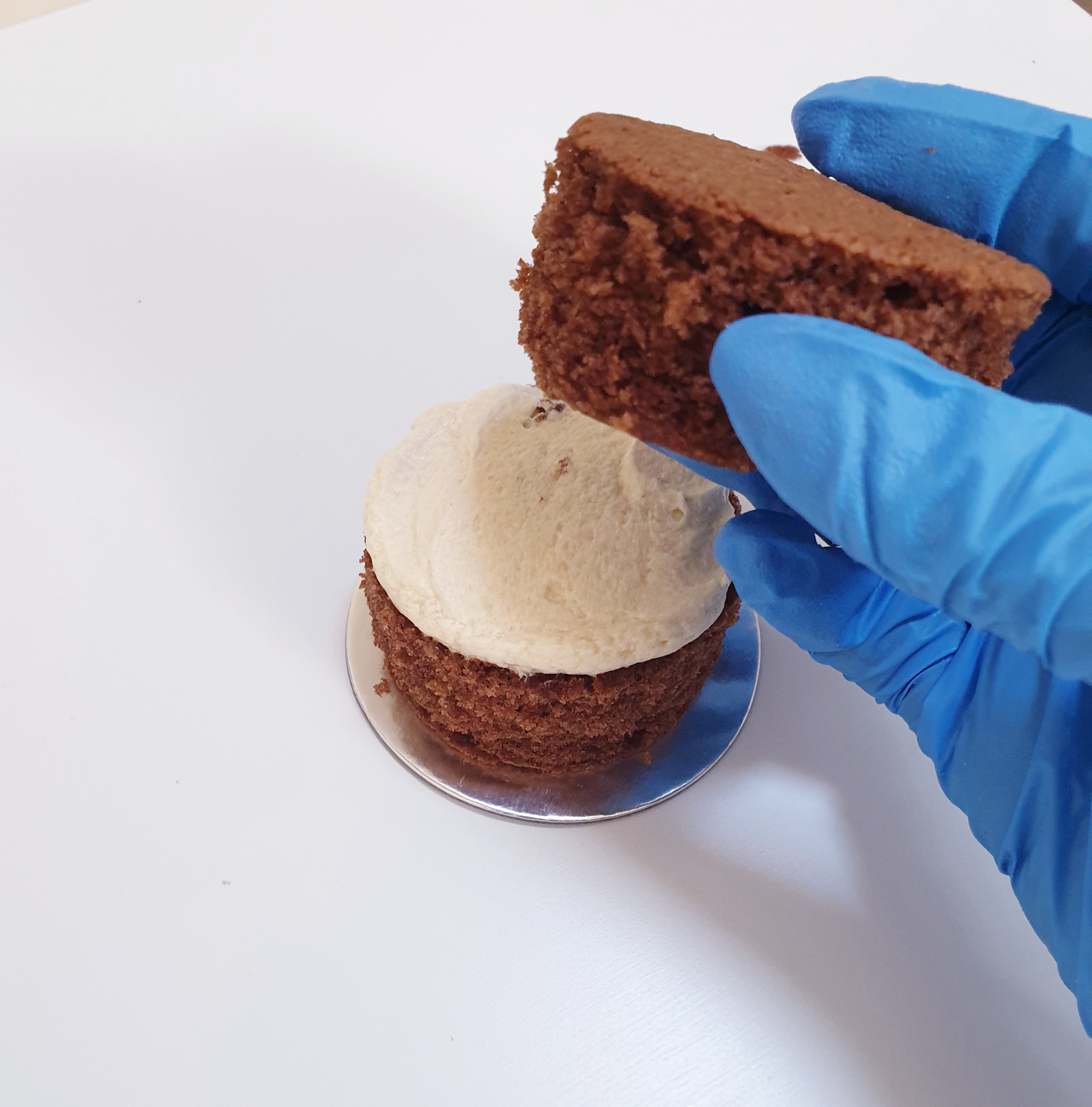 - Take another cut of cake (This time, soft side down), and place it onto the buttercream.
