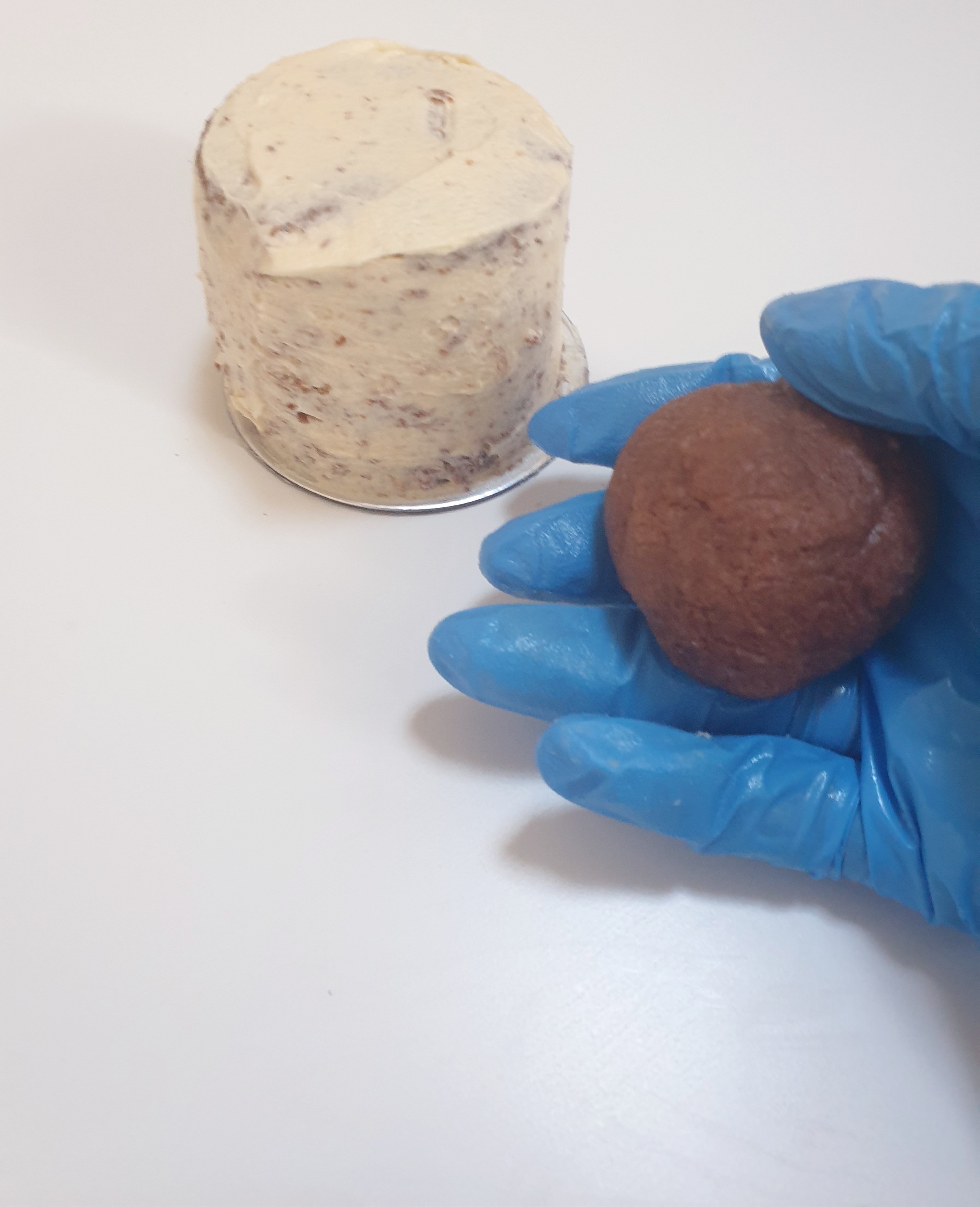 - Take the cake dough from the fridge and cut itinto the required amount of pieces (you will need a piece for the top of each cake in order to give it a more rounded shape.