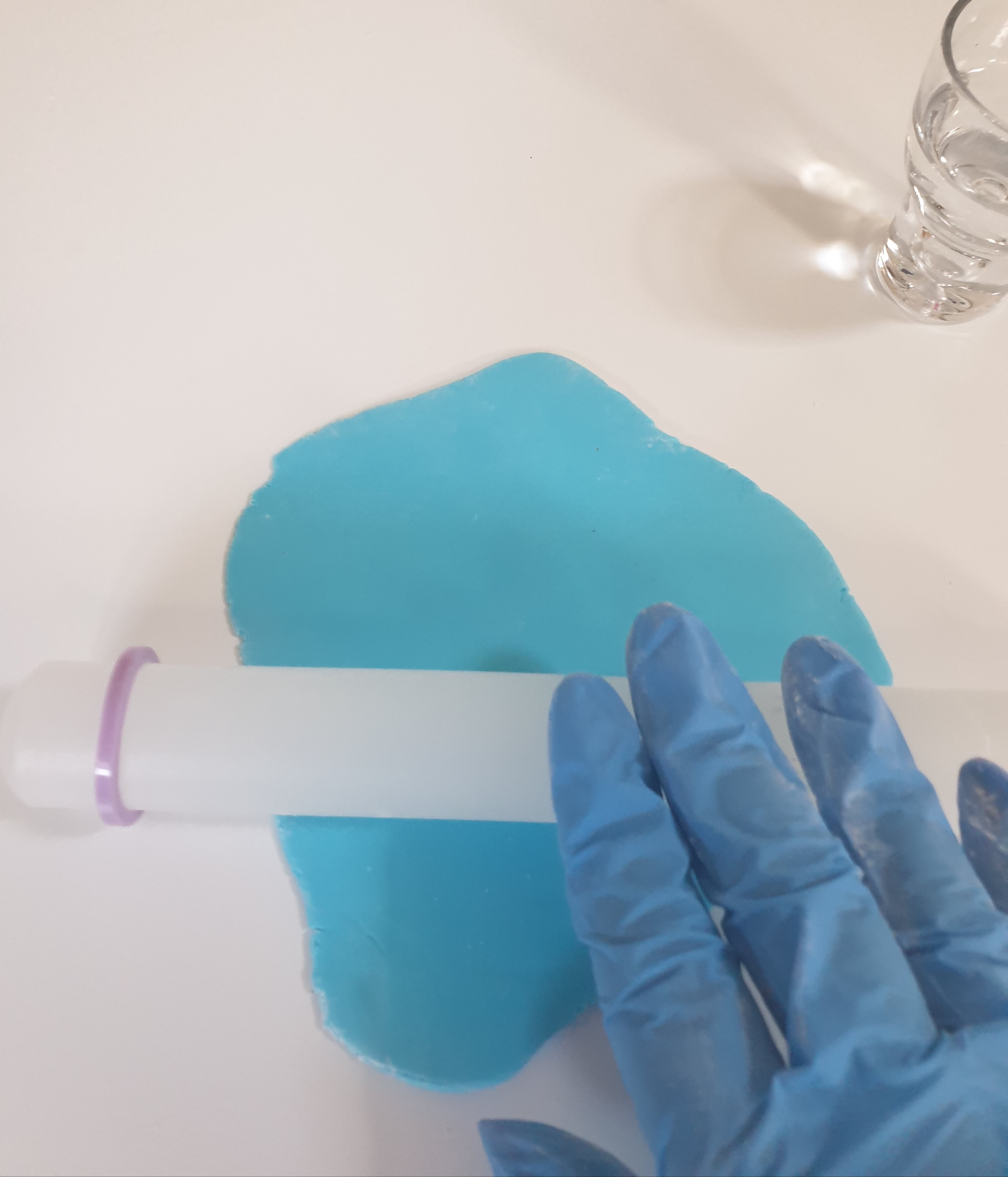- Roll out a flat piece of white fondant, and a flat piece of blue fondant.