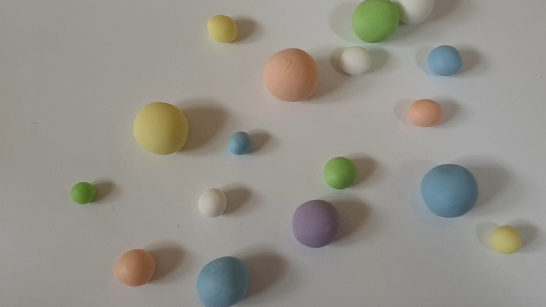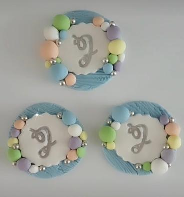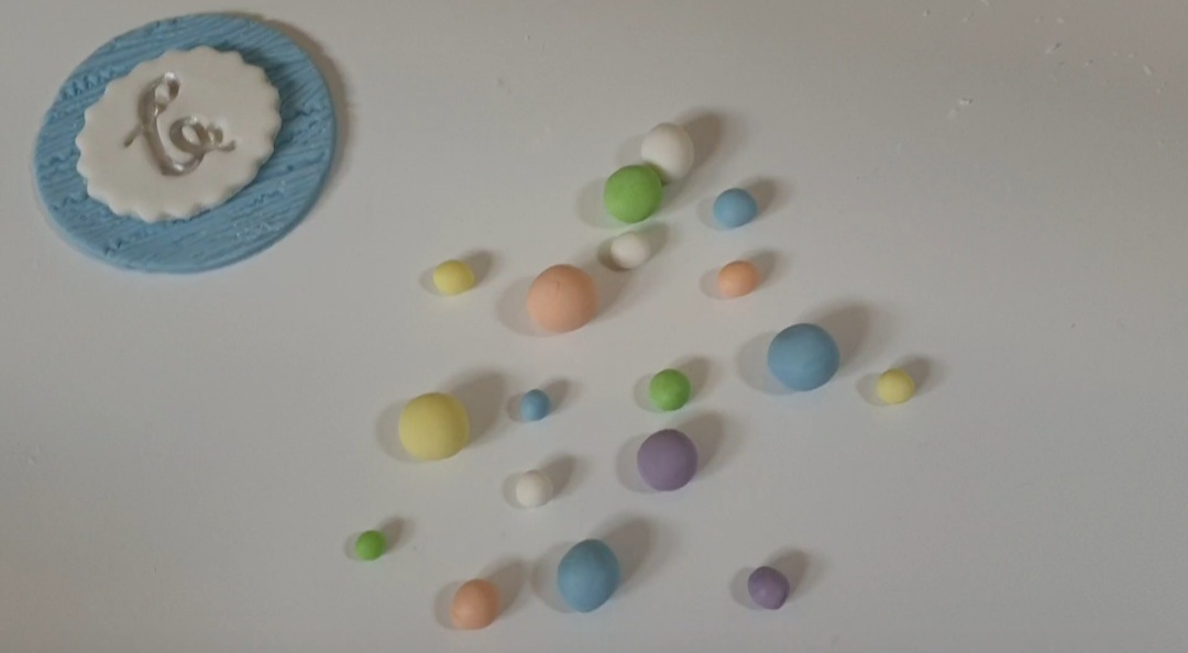 Start by taking the other colour fondants one by one. Break off small amounts of each colour and roll in the palm of your hand, one at a time, to create small balls. Continue this process until you have enough made to frame all of your toppers.