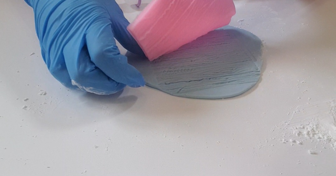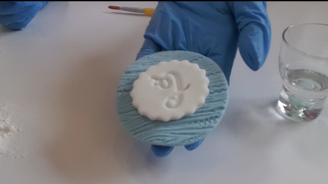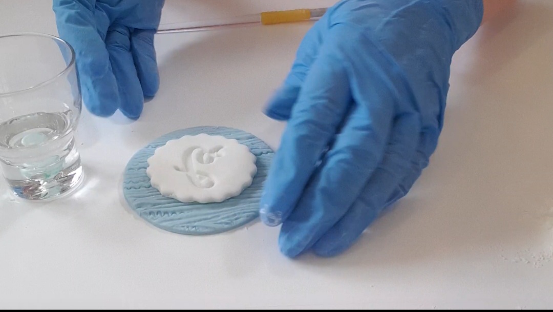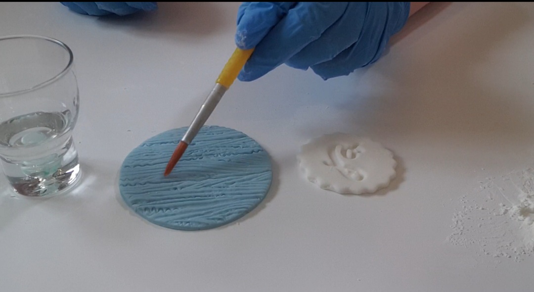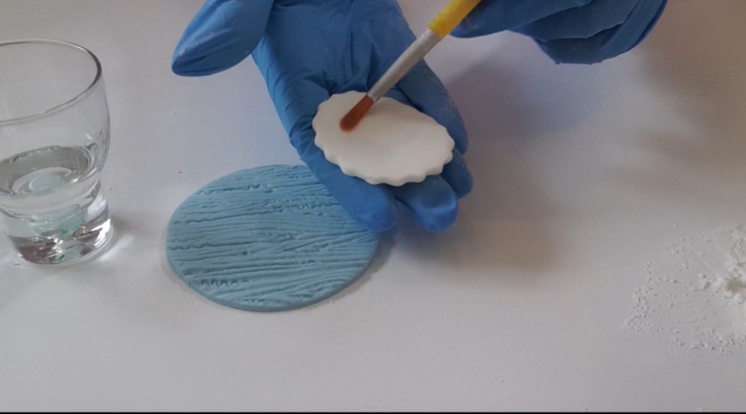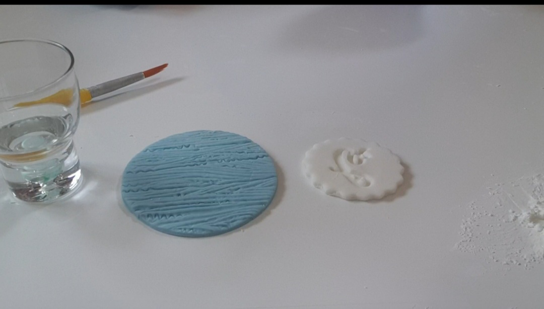 Using a small cake brush, brush the surface of the blue fondant with a drop of water. Pick up the circular white fondant, and gently brush some water on the back. Place the white fondant on top of the blue fondant, and press ever so gently so they stick together. Leave to dry slightly.