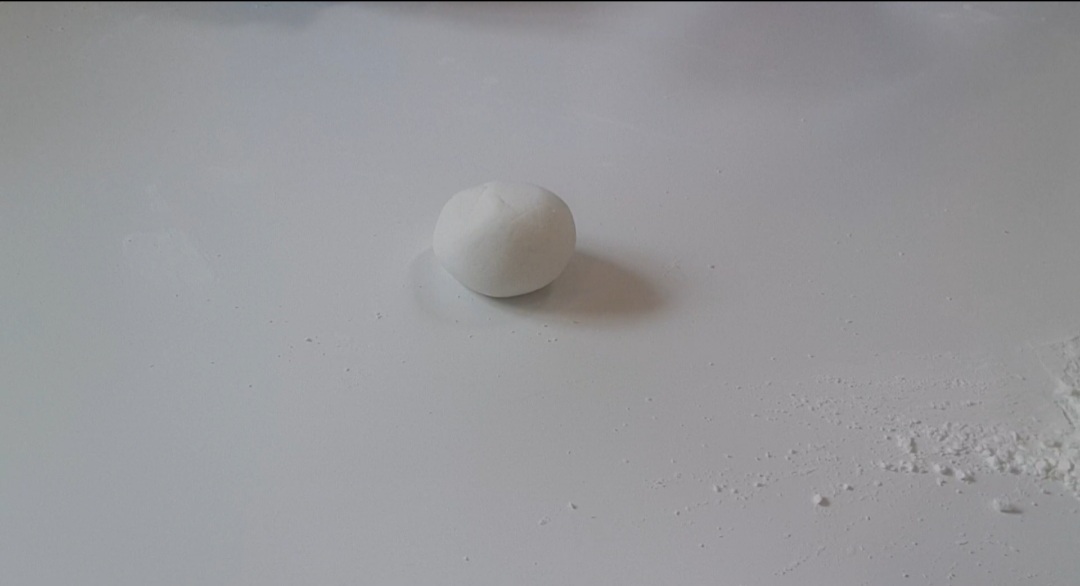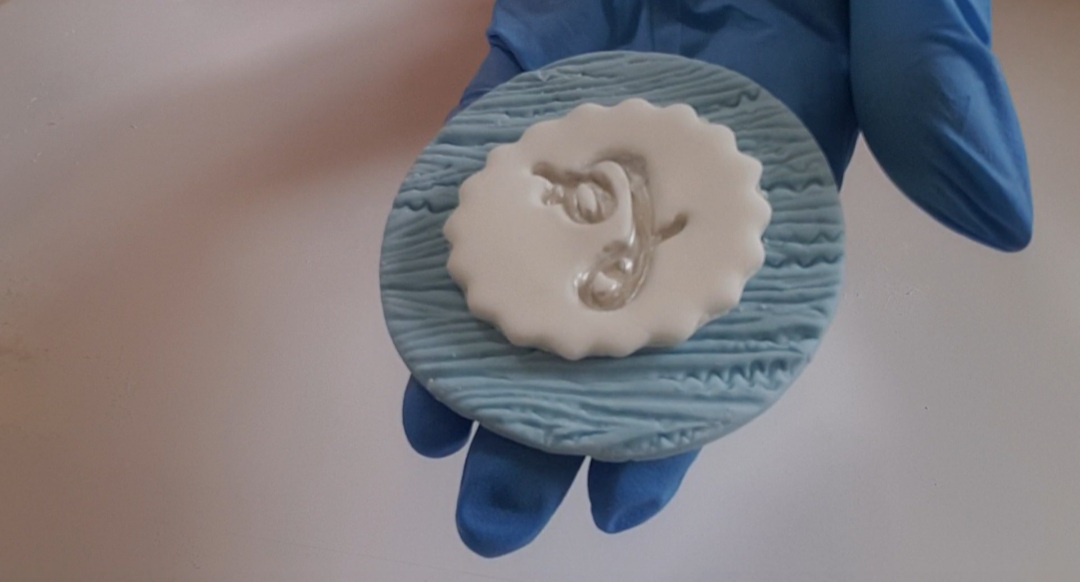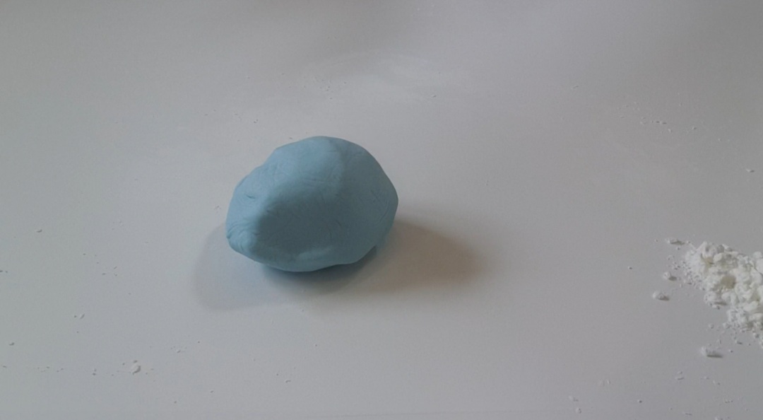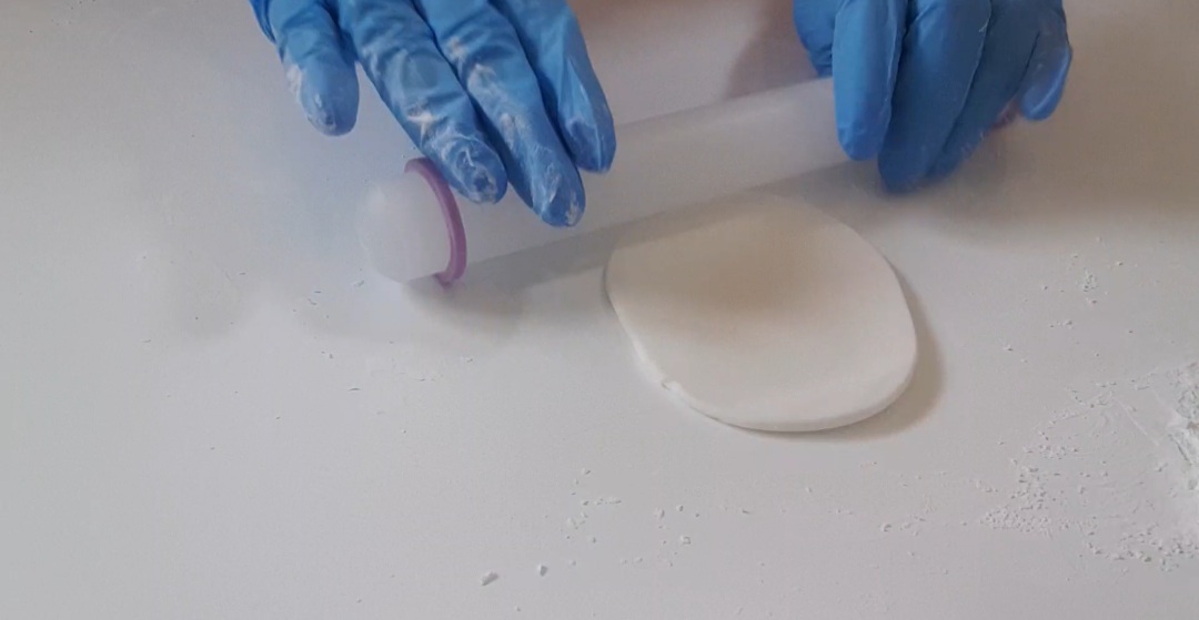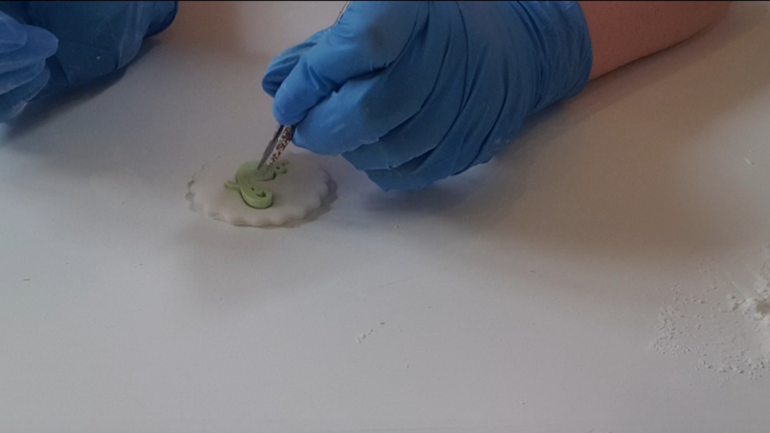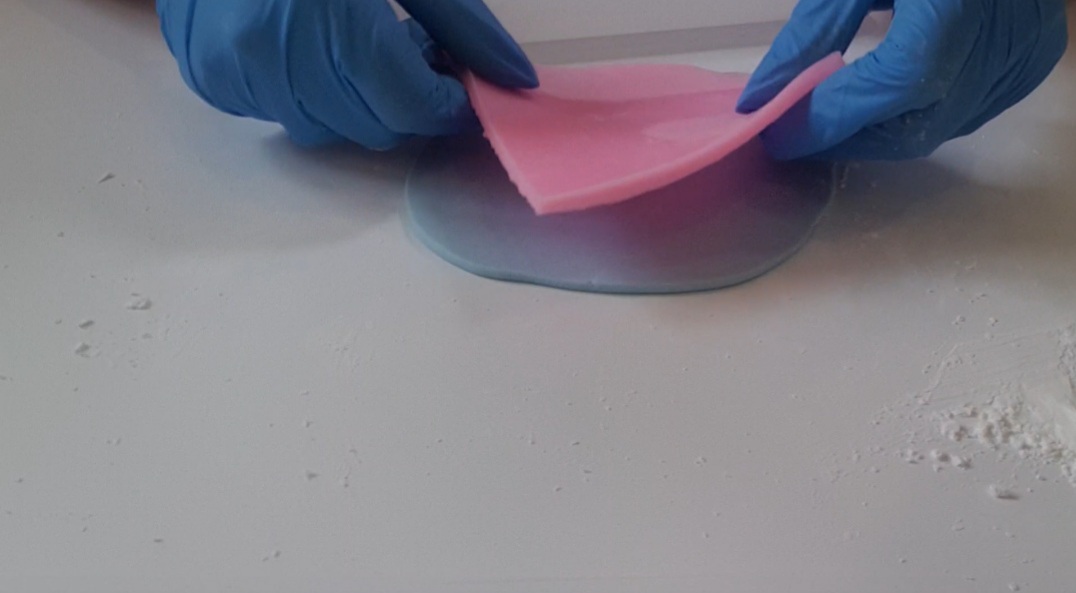 Using a small cake brush, brush the surface of the blue fondant with a drop of water. Pick up the circular white fondant, and gently brush some water on the back. Place the white fondant on top of the blue fondant, and press ever so gently so they stick together. Leave to dry slightly.