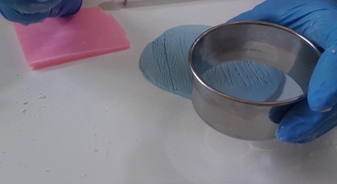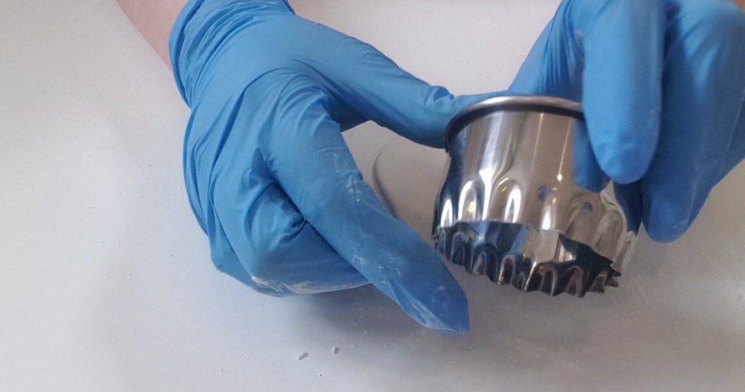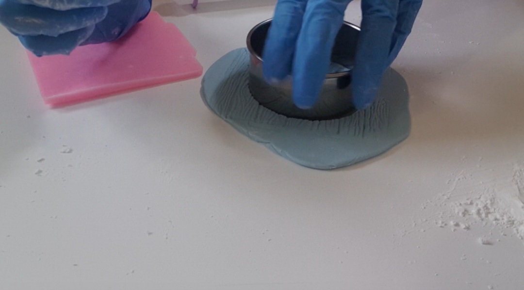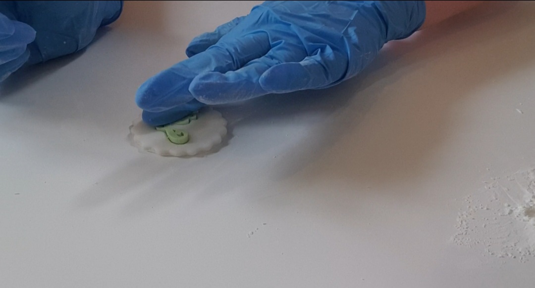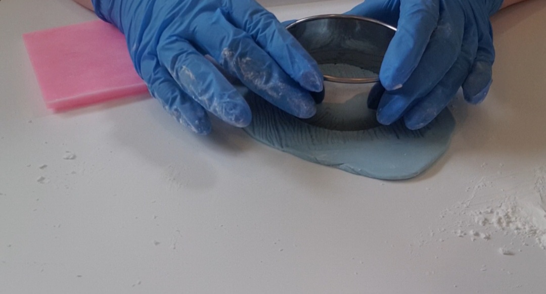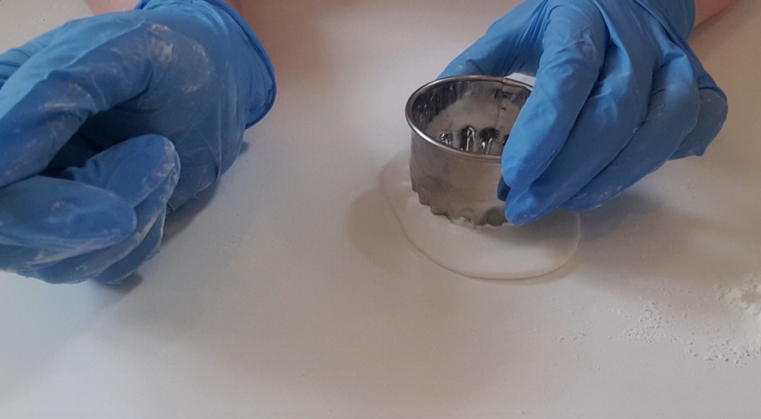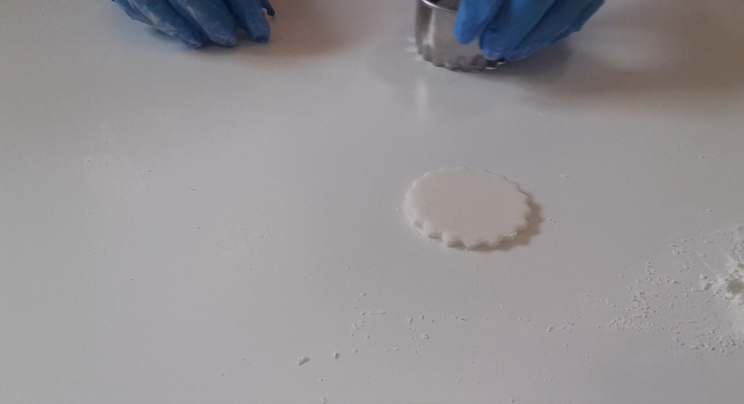 Taking your medium round cookie cutter (with the jagged edge) , again place this on your fondant and press down firmly. Twist from right to left to get a smooth edge. Remove excess fondant and leave it aside for later.