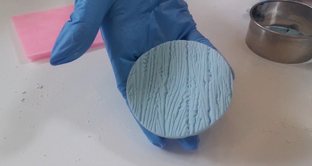 Using the wood effect mould, gently place it over the rolled fondant and push down to imprint. Gently peel and remove.